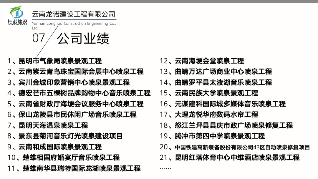 云南龍諾噴泉公司工程業(yè)績表